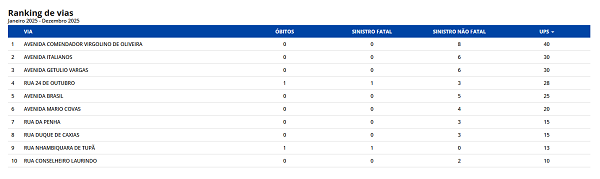 A rua 24 de Outubro aparece em quarto lugar no ranking, com três sinistros não fatais e uma morte registrada no local. Já a avenida Brasil contabilizou cinco sinistros não fatais, enquanto a avenida Mário Covas teve quatro ocorrências do mesmo tipo.