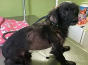 Após avaliação clínica, foi constatado que o animal apresentava diversos problemas de saúde, incluindo ferimentos pelo corpo e diagnóstico de Sarna demodécica, conhecida também como ‘sarna negra’.