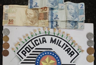 Durante a tentativa de fuga, o suspeito arremessou ao chão uma pequena quantidade de entorpecentes, sendo em seguida abordado. Em busca pessoal, os policiais encontraram R$ 57,95 em dinheiro no bolso de sua bermuda. Ao recolher o material dispensado, a equipe constatou tratar-se de 20 pedras de crack.