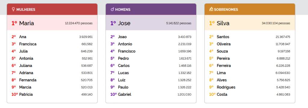Entre os sobrenomes, o campeão é Silva, que aparece em 34 milhões de brasileiros, o equivalente a 16% da população nacional. Em cidades de Pernambuco e Alagoas, o predomínio é ainda mais marcante, com mais de 60% dos habitantes carregando o tradicional sobrenome.
