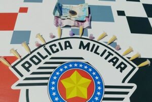 Durante a revista, os agentes localizaram 11 pinos de cocaína, cinco microfrascos contendo crack e a quantia de R$ 10 em dinheiro.