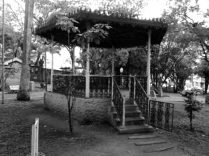Porém, o mais charmoso de todos os coretos que Itapira já teve, ou tem, ficava no antigo Largo da Matriz. Não consegui descobrir a data de sua inauguração, somente que ele foi demolido com a reforma da Praça, logo após a construção da nova Igreja de Nossa Senhora da Penha, na década de 1960. Com o telhado todo trabalhado possuía um cume central lembrando uma pirâmide e mais quatro bicos laterais formando cumeeiras³ bem definidas, sustentadas por colunas torneadas e encabeçadas por acabamento minuciosamente detalhado. Realmente uma verdadeira obra de arte, como vemos na foto seguinte, que jamais deveria ter sido removido da praça central, afinal, além de ser um patrimônio histórico e cultural da cidade foi palco de inúmeros acontecimentos que marcaram época em nossa terra.