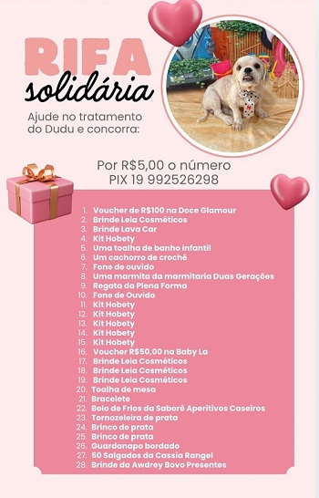 Cada número da rifa custa R$ 5,00, e todo o valor arrecadado será destinado exclusivamente ao pagamento do tratamento veterinário de Dudu. Atualmente, o valor total da dívida no pet é de R$ 3.543, enquanto a quantia disponível em conta é de R$ 1.365. Com isso, ainda é necessário arrecadar R$ 2.175, o equivalente a 435 números da rifa.