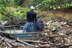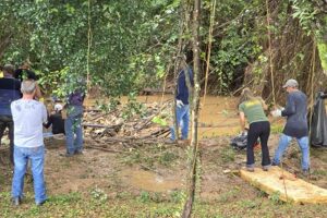 Através de denúncias que chegaram à secretaria, a equipe constatou a presença de diversos detritos descartados irregularmente nas margens do rio que, com as chuvas dos últimos dias, se acumularam em um ponto com bastante vegetação, que funcionou como uma barragem.
