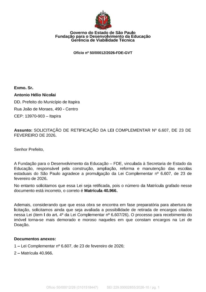 Apesar do avanço na liberação dos recursos, o início das obras ainda depende de ajustes por parte da Prefeitura. Um ofício encaminhado pela Fundação para o Desenvolvimento da Educação aponta inconsistências na Lei Complementar nº 6.607, de fevereiro de 2026, que trata da doação da área ao Estado.